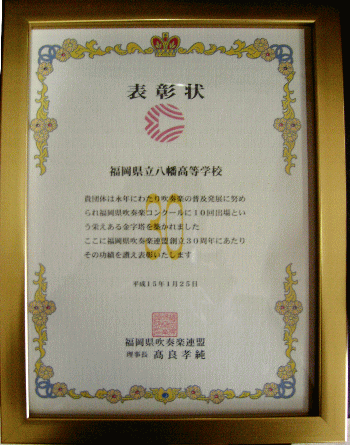 先日、福岡県吹奏楽連盟創立30周年にあたり、我が福岡県立八幡高等学校吹奏楽部は、福岡県吹奏楽コンクール(九州吹奏楽コンクール予選)が始まって18年間で、「県大会10回出場」として、表彰されました。1985年に始まった県大会制の初めの年で県大会出場を果たし、その後4年連続で県大会出場。1991年には九州大会出場という、快挙を果たしています。この結果は八高ブラスの諸先輩方や、顧問の先生、指導者の方々の残した、大きな功績であります。